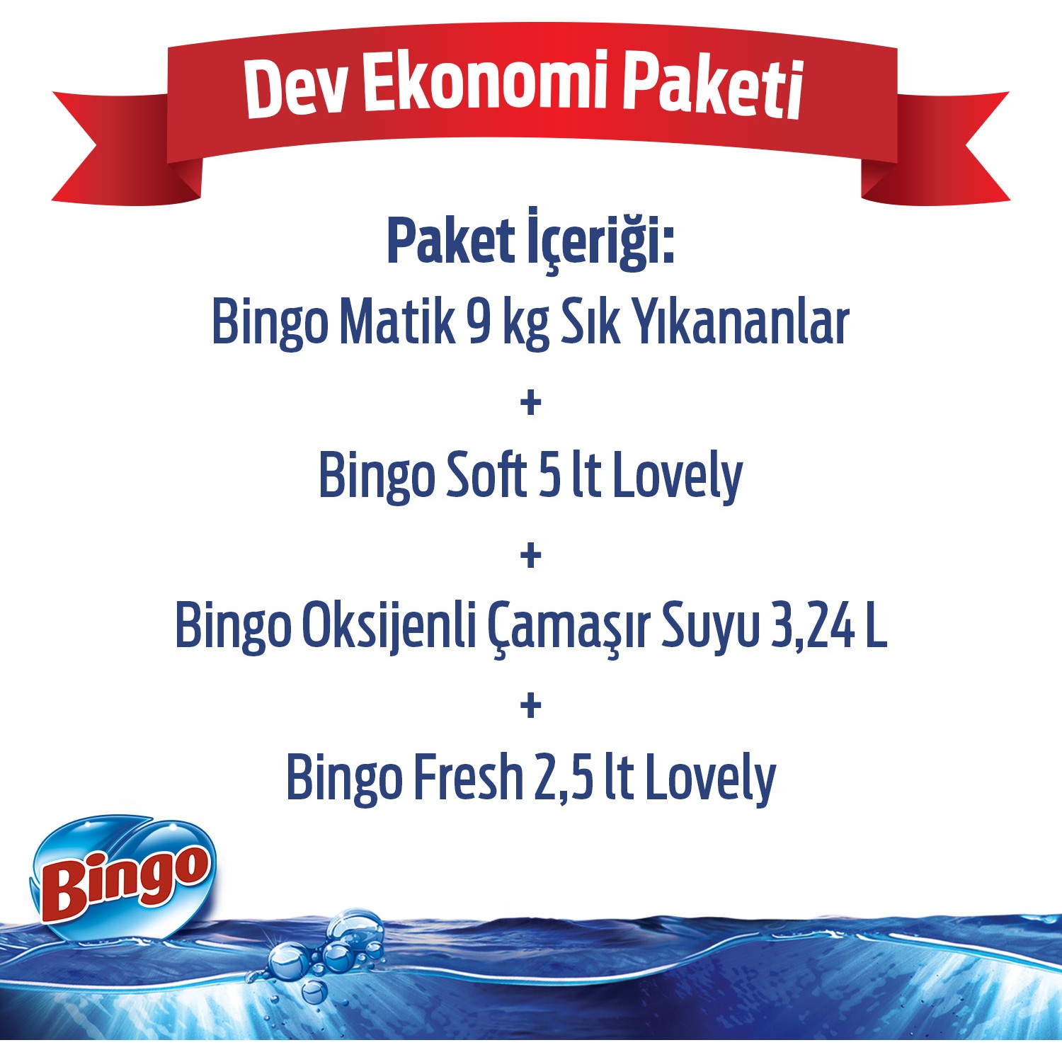 Bingo Dev Ekonomi Paketi Bingo Matik 9 kg Sık Yıkananlar + Bingo Soft 5 lt Lovely + Bingo Fresh 2,5 lt Mutlu Yuvam + Bingo Oksijen Çamaşır Suyu 3,24 lt Çam Kokulu